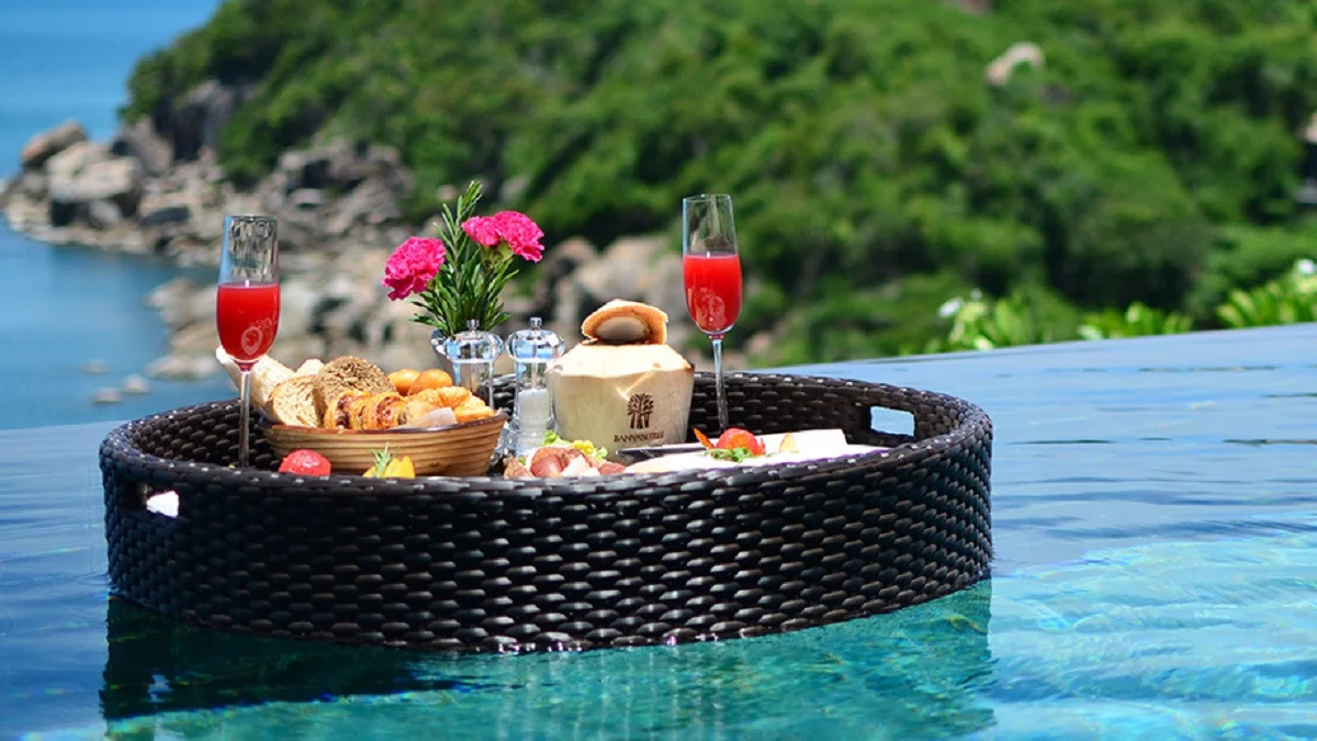 Wie weit entfernt vom Alltag fühlt sich ein Frühstück auf einem schwimmenden Tablett im eigenen Pool an?