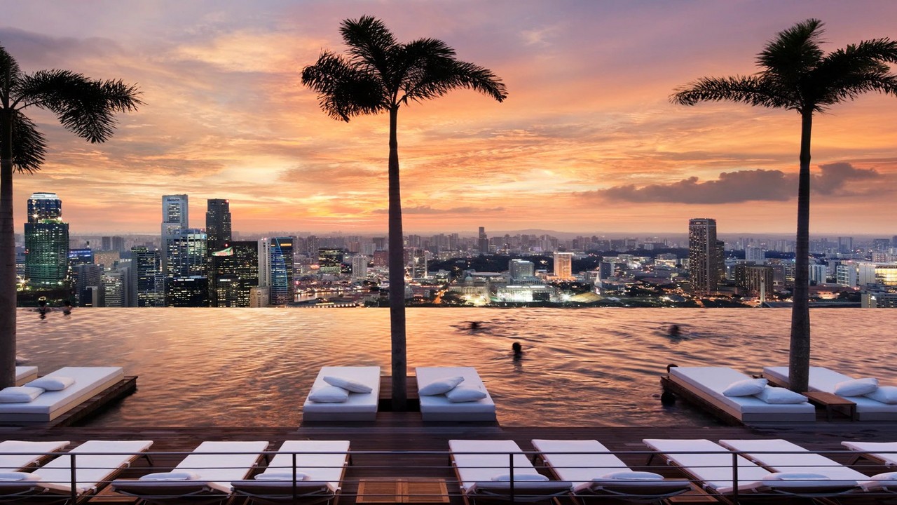 Mit 150 Metern Länge ist der Infinity Pool des Marina Bay Sands der längste der hohen Pools dieser Erde. Er ist Teil des Sky Park Observation Desks, das die drei Türme des Hotels miteinander verbindet.
